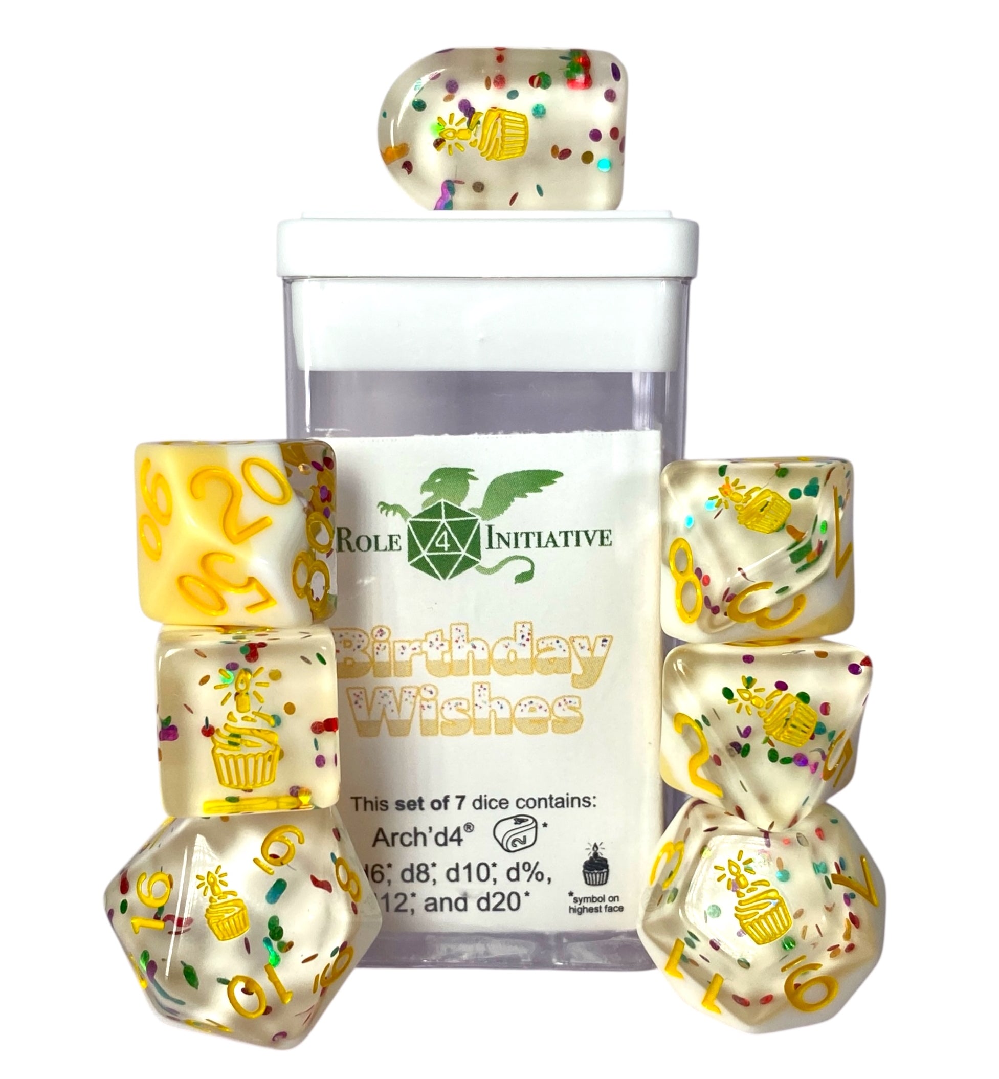 Each set of R4I dice averages over 30% larger in size than traditional dice for higher visibility and better rollability! This Set of 7 includes the following shapes: Arch'd4, d6, d8, d10, d%, d12, and Balance'd20.