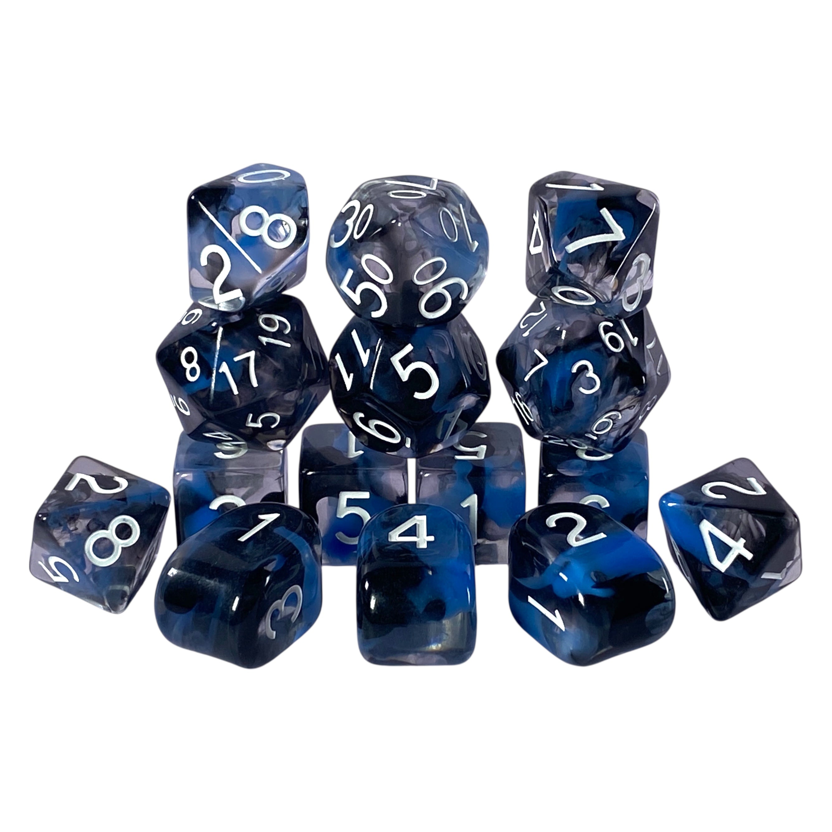 Large High-Visibility Polyhedral Dice: Diffusion Midnight - diffused blue and black w/ white numbers