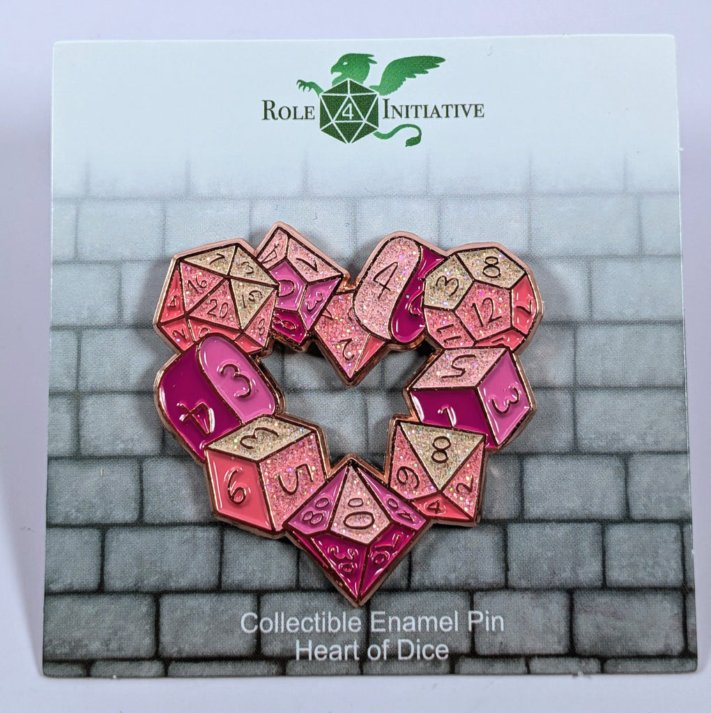 Some of the character class pins have glitter, depicting that character's magical powers, and this is mirrored in the matching dice for those classes.