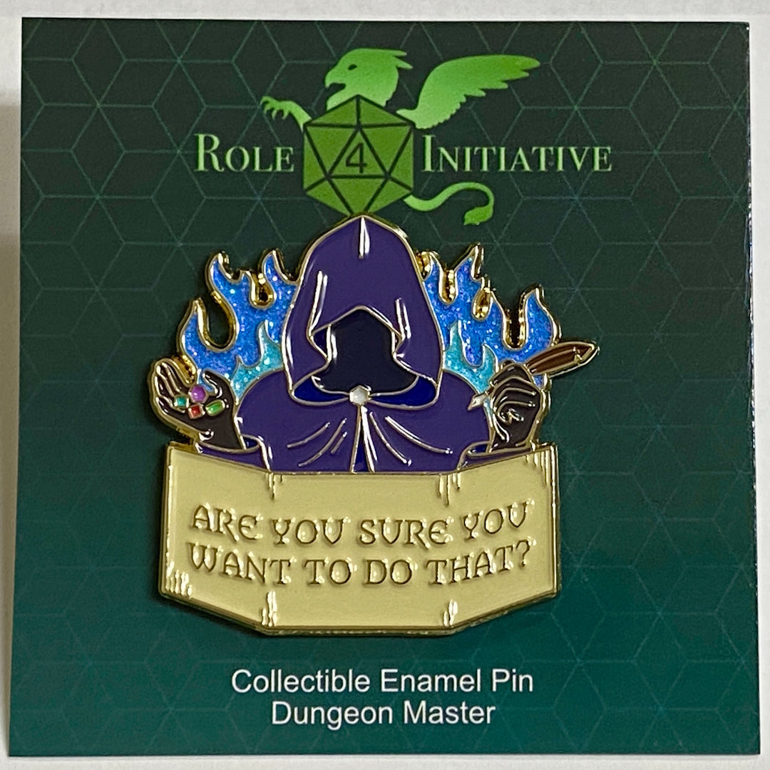 This 1.5"-wide glittering enamel pin depicts a purple hooded dungeon master in front of licks of blue fire. They hold a quill pen and dice in their hands, and in front of them rests their game screen, quoting one of the age-old DM questions: Are you sure you want to do that?